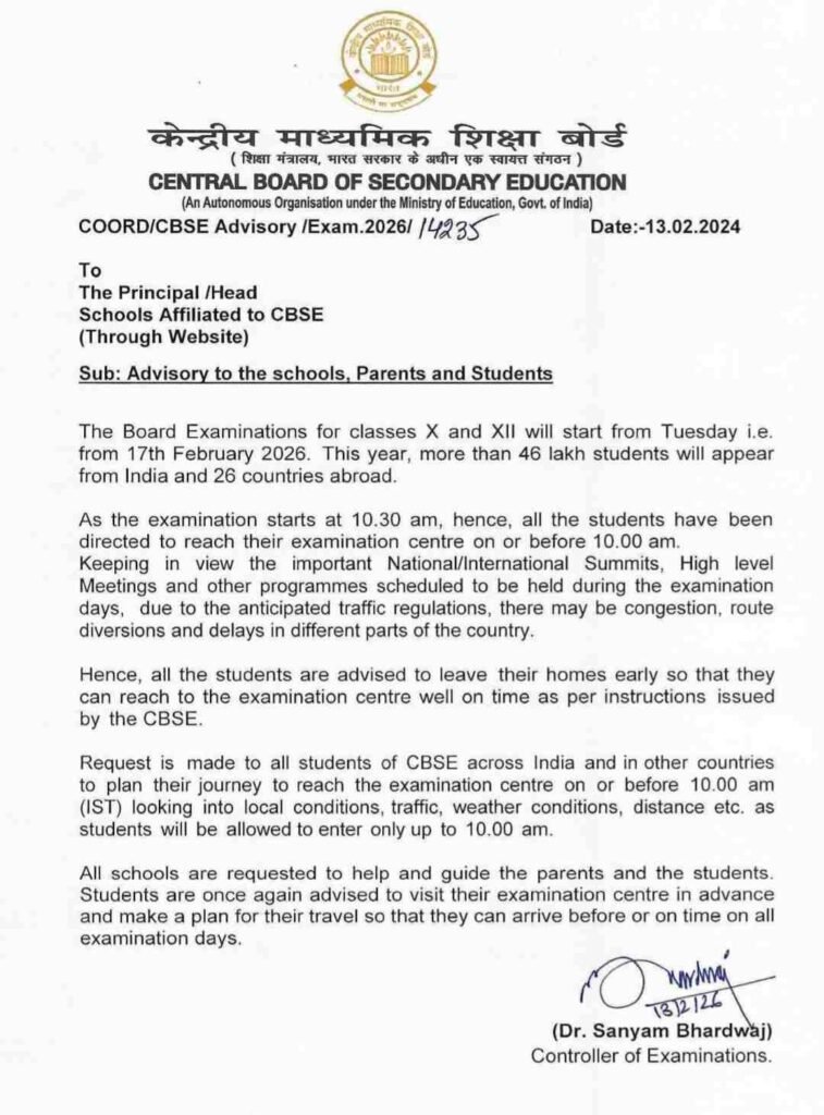 CBSE ने बताया है कि परीक्षा अवधि के दौरान देश के विभिन्न शहरों में राष्ट्रीय और अंतरराष्ट्रीय कार्यक्रम आयोजित हो सकते हैं। इससे ट्रैफिक डायवर्जन (Traffic Diversion), जाम और रूट परिवर्तन जैसी स्थिति बन सकती है। छात्रों और अभिभावकों को सलाह दी गई है कि वे स्थानीय ट्रैफिक अपडेट (Local Traffic Update) और मौसम की स्थिति को ध्यान में रखते हुए घर से समय पर निकलें।