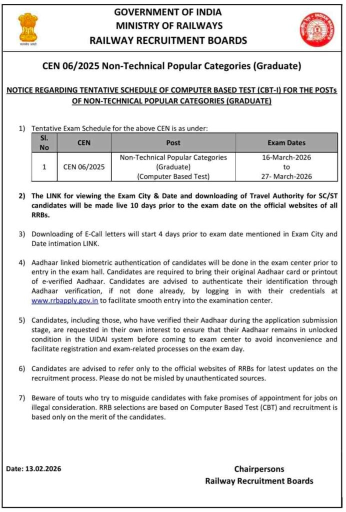रेलवे में सरकारी नौकरी का सपना देख रहे लाखों युवाओं के लिए बड़ी खबर है। रेलवे भर्ती बोर्ड (Railway Recruitment Board) ने आरआरबी एनटीपीसी ग्रेजुएट लेवल भर्ती 2026 की परीक्षा तिथि घोषित (RRB NTPC Exam 2026 Date Out) कर दी है। जिन अभ्यर्थियों ने CEN 06/2025 के तहत आवेदन किया था, उनके लिए अब तैयारी का अंतिम चरण शुरू हो चुका है। जारी आधिकारिक नोटिस के अनुसार कंप्यूटर बेस्ड टेस्ट (CBT-1) का आयोजन 16 मार्च 2026 से 27 मार्च 2026 तक किया जाएगा।